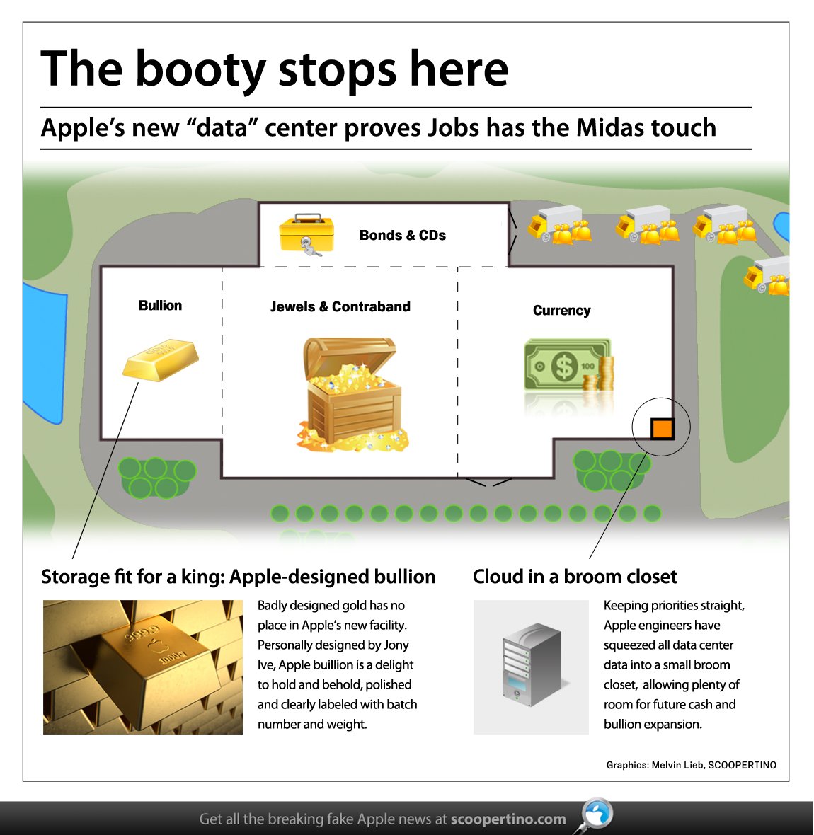 Incoming bullion awaits an Apple-engineered smelting process to ensure that it meets the Apple gold standardThe largest vault in the facility — covering a mind-numbing 230,000 square feet — would make Jack Sparrow blush. Here, pirate-style, Apple plans to store jewels and contraband in overflowing chests. This jives with recent rumors that Apple Stores will soon be accepting jewelry from cash-strapped patrons.