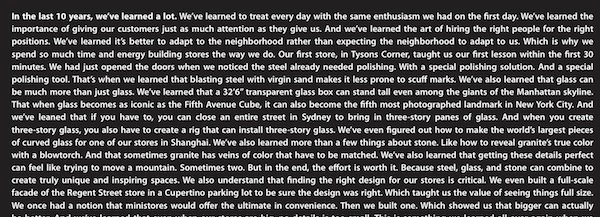 In the last 10 years, we’ve learned a lot. We’ve learned to treat every day with the same enthusiasm we had on the first day. We’ve learned the importance of giving our customers just as much attention as they give us. And we’ve learned the art of hiring the right people for the right positions. We’ve learned it’s better to adapt to the neighborhood rather than expecting the neighborhood to adapt to us. Which is why we spend so much time and energy building stores the way we do. Our first store, in Tysons Corner, taught us our first lesson within the first 30 minutes. We had just opened the doors when we noticed the steel already needed polishing. With a special polishing solution. And a special polishing tool. That’s when we learned that blasting steel with virgin sand makes it less prone to scuff marks. We’ve also learned that glass can be much more than just glass. We’ve learned that a 32’6†transparent glass box can stand tall even among the giants of the Manhattan skyline. That when glass becomes as iconic as the Fifth Avenue Cube, it can also become the fifth most photographed landmark in New York City. And we’ve learned that if you have to, you can close an entire street in Sydney to bring in three-story panes of glass. And when you create three-story glass, you also have to create a rig that can install three-story glass. We’ve even figured out how to make the world’s largest pieces of curved glass for one of our stores in Shanghai. We’ve also learned more than a few things about stone. Like how to reveal granite’s true color with a blowtorch. And that sometimes granite has veins of color that have to be matched. We’ve also learned that getting these details perfect can feel like trying to move a mountain. Sometimes two. But in the end, the effort is worth it. Because steel, glass, and stone can combine to create truly unique and inspiring spaces. We also understand that finding the right design for our stores is critical. We even built a full-scale facade of the Regent Street store in a Cupertino parking lot to be sure the design was right. Which taught us the value of seeing things full size. We once had a notion that ministores would offer the ultimate in convenience. Then we built one. Which showed us that bigger can actually be better. And we’ve learned that even when our stores are big, no detail is too small. This is something we learned all over again when we restored the Paris Opera store down to the last of its more than 500,000 tiles. We’ve also learned that our customers like open spaces, glass staircases, and handcrafted oak tables. And that those spaces don’t need to smell like pine trees or tomatoes to make then inviting. We’re constantly working to make our stores more artful, more iconic, and more innovative. And we’re awfully proud of every single one. We’re proud of our stores not just because they’re successful, but because of everything they’ve taught us. Along the way Apple Stores have made Apple stronger as a company. Over the past 10 years, we’ve learned that our stores are the embodiment of the Apple brand for our customers. Now, our customers just happen to be the entire reason we’re here, so let’s dedicate a few words to them. Around the time we opened the store in Tysons Corner in 2001, everyone else was trying to talk to their customers less. Which made us think that maybe we should talk to them more. Face-to-face if possible. So we’ve found ways to strike up a conversation at every possible opportunity. We talk while they play with the products on the tables. And when they join us for a workshop. These conversation have taught us that customers love our products, but what they really want is to make a scrapbook out of family photos. They want to make a movie about their kid. Or a website about traveling across the country. Which has taught us that Apple Stores can and should be centers for creativity. And we’ve figured out through programs like Apple Camp and Youth Workshops that creativity doesn’t care about age. The movies and the slideshows we’ve seen kids make are proof that all you need are the right tools and an idea. And we must be doing something right, because the kids’ smiles are just as big as ours. We’ve also learned that musicians can record an album in our stores that goes to the top of the charts. And that award-winning film directors are interested not just in our computers but in our workshops. We’ve learned a lot about having fun. And we’ve learned our customers like to use our products for business too. Experience has taught us that having one Pro Day per week dedicated to business customers isn’t enough. That we need to be open for business every day. And have space devoted to business training sessions, workshops, and events. We’ve learned that every staff member should be just as fluent in the needs of a business customer as the needs of any other customer. Our millions of conversations with customers of every stripe have taught us it’s not about making people feel like a computer or phone loves them. That’s impossible. Instead, it’s about giving people the tools to do what they love. And we’ve learned how to create amazing programs like One to One and Personal Setup to give people those tools. We created programs like these to replace fear with confidence. Because our customers have shown us that the ownership experience is even more important than the sale. We learned all this by asking questions. And genuinely listening to the answers. And to be sure we’re hearing everything, we’ve learned to converse in 36 languages, and a few local dialects as well. We’ve even learned a few cultural things. The proper use of the word y’all, for example. And our Japanese customers once taught us that their superheroes don’t wear capes. Which also taught us to see feedback as a gift. We’ve learned that a visit to the Genius Bar can fix more than 
