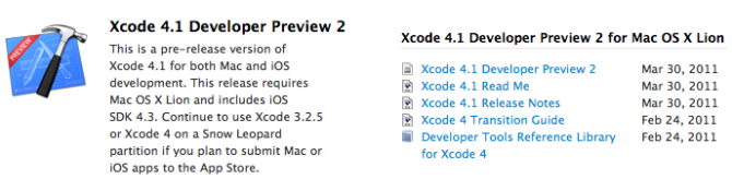 - Xcode 4.1 Developer Preview 5 | xcode_4.1_developer_preview_5.dmg | ~ 4.35 GB | [filesonic]: